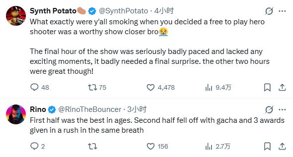 知名游戏博主Synth Potato与Rino也在评论区中表示:"你们到底抽了什么风,才会觉得一个免费游玩的英雄射击游戏能当压轴项目啊兄弟?整场典礼的最后一小时节奏严重失衡,完全没有任何让人兴奋的高光时刻,迫切需要一个真正的最终惊喜。前面两个小时倒是挺不错的!"