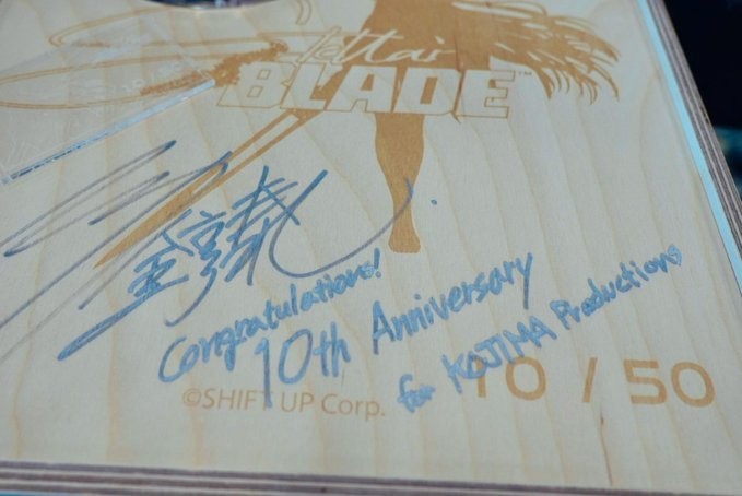 小岛秀夫在个人社媒发布了四张照片,照片中他与Shift Up首席影像总监金英浩共同出镜。画面里小岛捧着一个带有《星刃》标志雕刻及开发团队签名的木质礼盒,盒内装着游戏女主角伊娃的限量版手办(该手办是Shift Up工作室与Flare、Cerberus Project合作推出的,预计2027年发售)。礼盒表面可见"Stellar Blade 10th Anniversary Production"字样以及编号"10/50",彰显其全球仅限量50份的珍贵性。