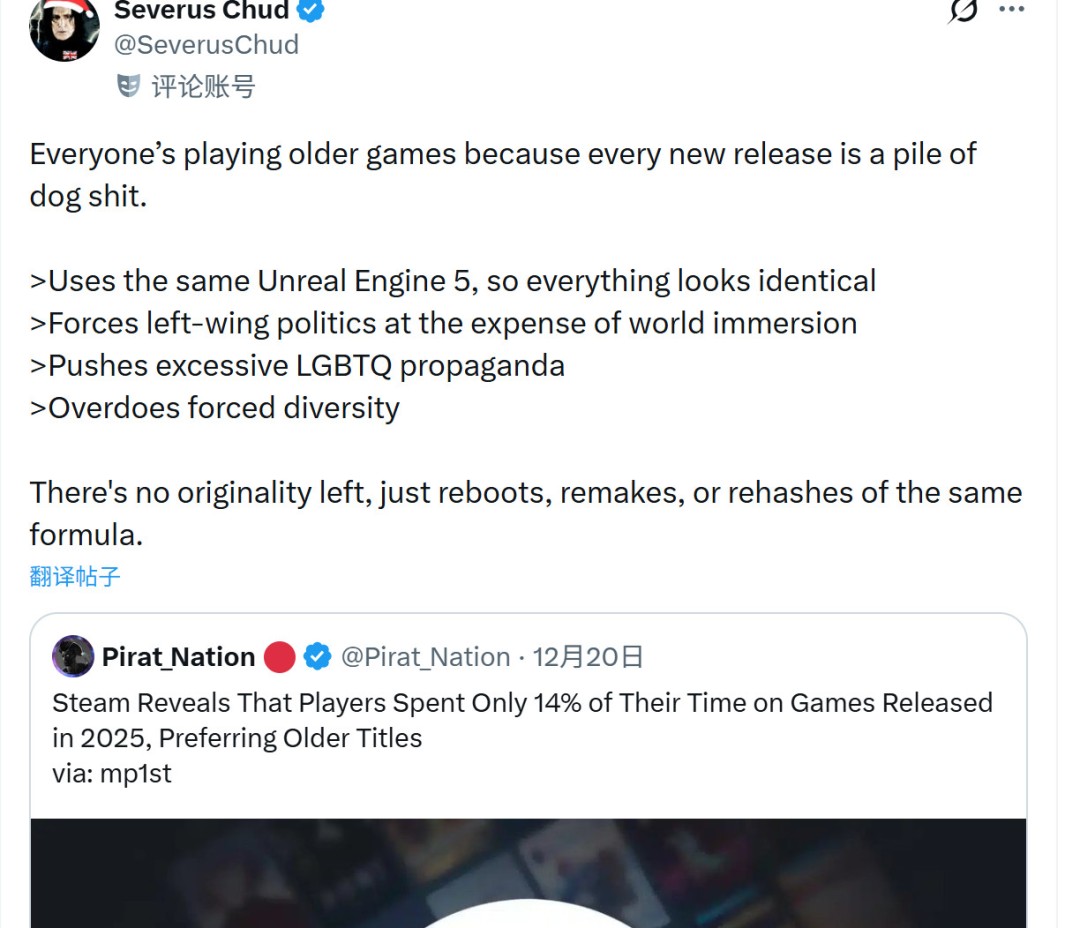 一名用户@SeverusChud发帖表示:“大家都在玩老游戏,因为每一款新游戏都烂得一塌糊涂。 原因在于: