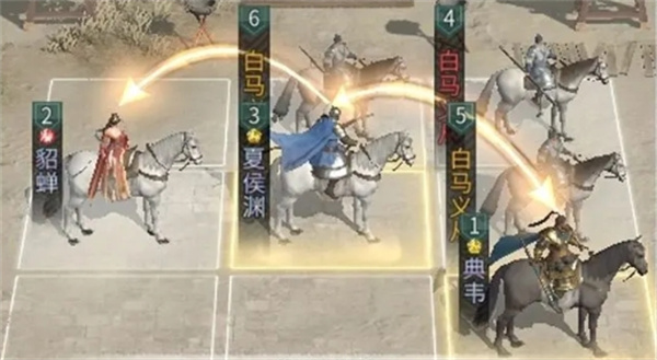 夏侯渊天赋技能在追击触发时概率发动,需将其放置在貂蝉、典韦的追击格上,故采用图示站位。