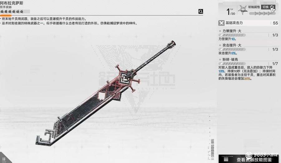 阿布拉克萨斯的战略价值在于其独特的破防体系。13%防御削减配合20%失衡值积累,使其成为控制链中的关键节点。虽然基础属性增幅较低,但在对抗高护甲敌人时,该武器可使团队整体输出效率提升约40%。推荐与减速/眩晕类技能形成combo,尤其适合剿灭作战场景。