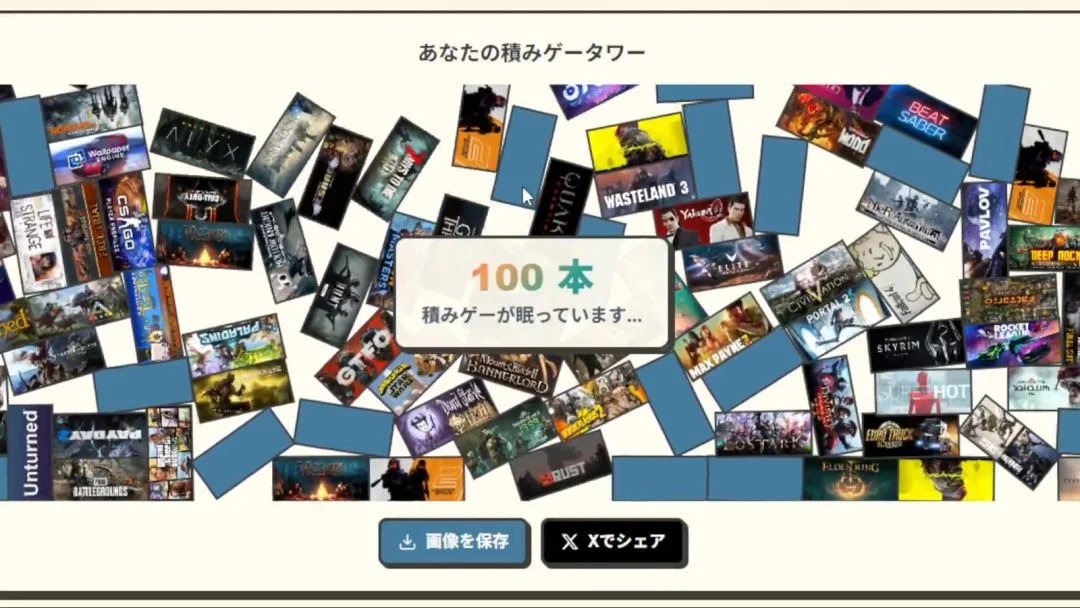 MYU是一位活跃于插画与游戏设计领域的创作者,曾担任《残音系少年少女》的企划、剧本与角色设计。此次发布的工具通过与用户的Steam账户关联,自动统计库中尚未启动过的游戏数量,并以这些游戏的封面横幅图片构建成一座垂直堆叠的「游戏堆积塔」。界面同时清晰显示用户的"游戏堆积率",让玩家对自己"只买不玩"的状况一目了然。