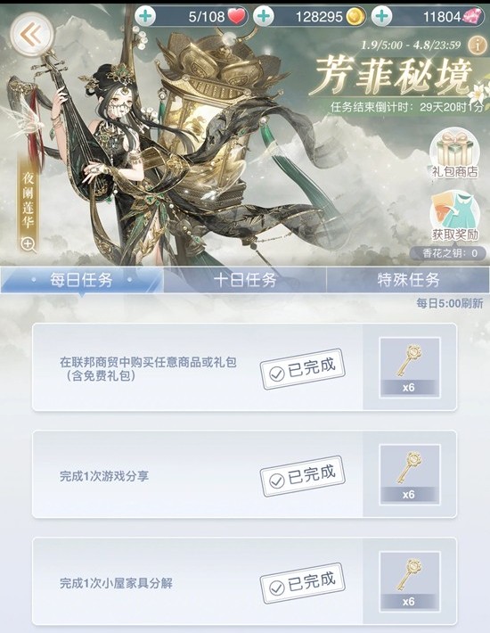 基础策略:选定目标套装后,通过完成三类任务(每日/十日/特殊)获取香花钥匙,累计翻牌次数即可兑换对应套装。
