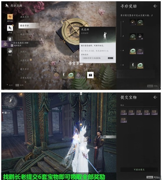 多人世界来到图中位置,一直大轻功刷新并击杀野猪拾取即可速刷宝物(每一只拾取都会给),找到鹳长老提交6套宝物,之后藏匿10次宝物即可领取全部奖励