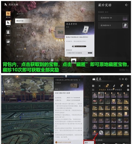 背包内,点击获取到的宝物,点击 "藏匿"即可原地藏匿宝物,藏珍10次即可获取全部奖励