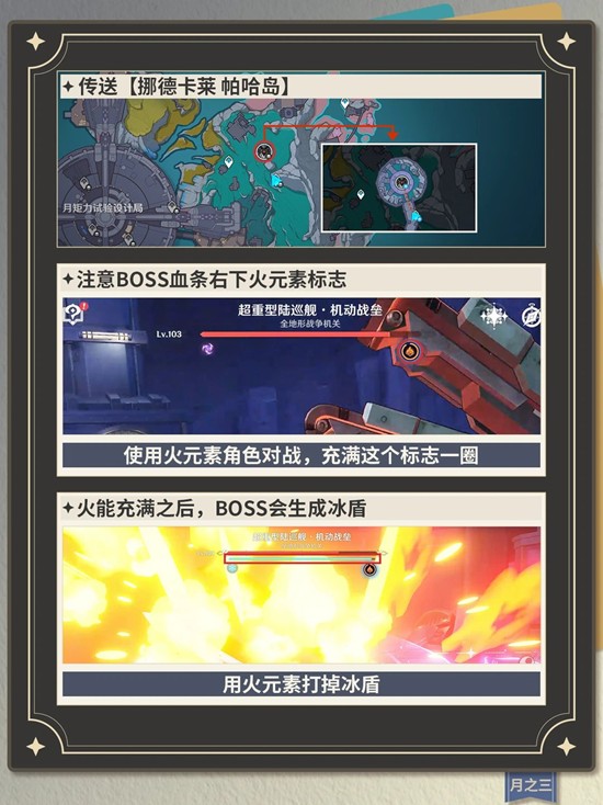 首先传送至【挪德卡莱 帕哈岛】的战斗区域。开战后要特别注意BOSS血条右下角的火元素标志,这是解锁成就的关键提示。建议使用火元素角色进行对战,通过持续的火元素攻击来充满这个标志。