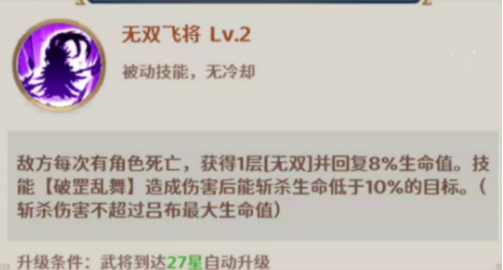 吕布的绝学侧重爆发与统治级战场控制。"无双"状态与"阵亡强化"机制可叠加生效,显著提升攻击力、暴击率与生存阈值。该组合使其在短时间内的输出密度与容错能力远超常规武将,尤其适合关键节点的逆转与收割。