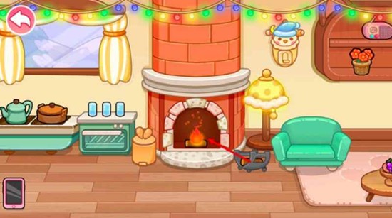 房间内还藏有小彩蛋,比如那个可以互动的壁炉,你只需要向其中放入一块木头,壁炉就会被自动点燃,跳跃的火焰立刻增添了许多暖意。此外,在墙上挂上顺路钟表和五颜六色的彩灯,圣诞节的节日氛围就更加浓郁了。