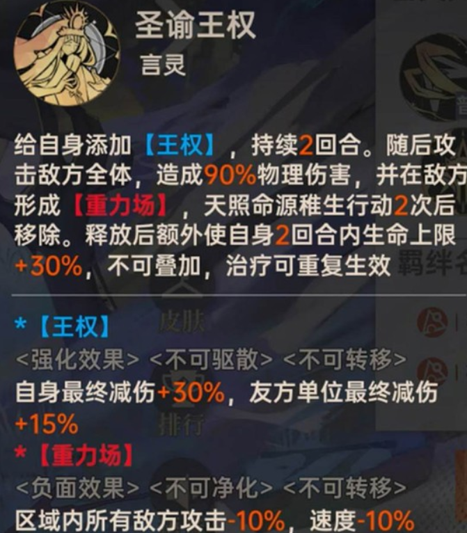 释放言灵"圣谕王权"是天照命的核心。技能发动后,源稚生自身获得持续2回合的"王权"状态,期间自身减伤提升30%,全体友方获得15%减伤。同时,该技能会对全体敌人造成伤害,并在敌方阵营制造一个"重力场"。重力场能降低场内所有敌人10%的攻击与速度,其持续时间将持续到天照命行动2次后。此外,释放技能后,天照命会立即获得一个相当于自身生命上限30%的治疗效果,此生命上限加成不可叠加,但治疗效果可重复生效。