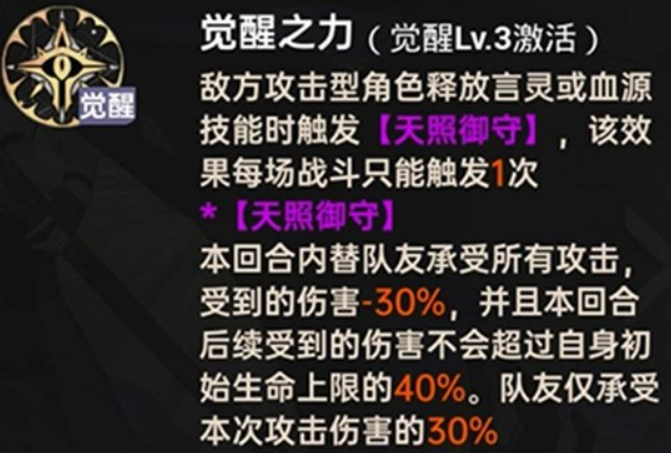 天照命的觉醒技能带来了"超重力"机制。当处于重力场中的敌人攻击天照命时,会为其叠加一层"超重力"状态。携带超重力状态的敌人,每次行动结束后都会受到基于天照命攻击力的真实伤害,该状态最多可叠加3层。这一机制使得敌方在重力场内持续行动会不断承受真实伤害,有效压制高防御目标。