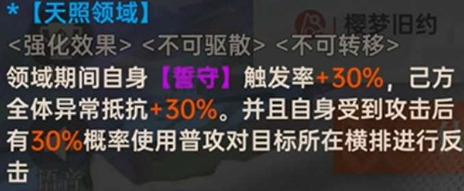 开启天照领域后,源稚生的防守反击能力得到显著强化。领域期间,自身的"誓守"触发率提升30%,同时全队的异常状态抵抗获得提高。最关键的是,当天照命受到攻击时,有30%的概率使用普通攻击反击目标所在的整排敌人,这使他能有效反制敌方的集火。