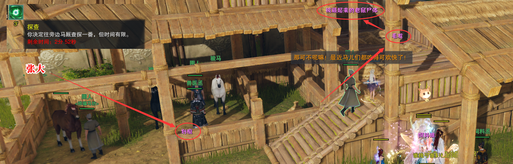 3、对话完【张大】之后得到一个3分钟的"探查buff",分别互动马厩中的【划痕】、【毛发】、【被藏起来的老鼠尸体】,buff如果消失了可以再次对话张大重新获得buff