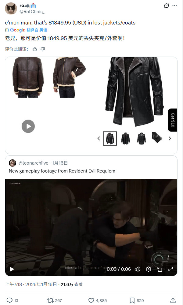 在X上,RatClinic_分享了一段《生化危机9:安魂曲》中里昂没穿外套的游戏片段,并指出截至目前,里昂至少已经在丢失的夹克上花掉了1849.95美元。这个数字的计算依据是:一件Schott NYC二战款皮质飞行员夹克,售价1690美元——这正是《生化危机4:重制版》中里昂外套的灵感来源,再加上一件与《生化危机9:安魂曲》中类似的Arctic Patrol Coat(北极巡逻外套)。