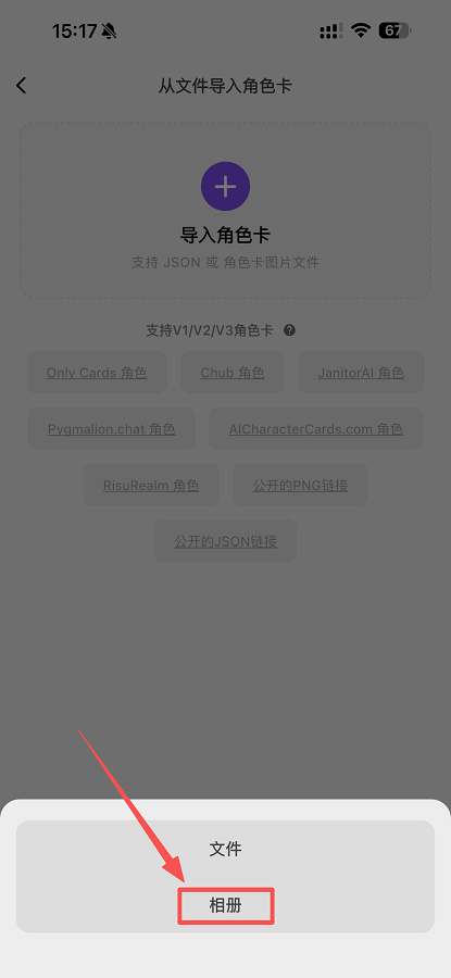 选择图片导入角色卡。点击“从照片图库导入”,并选择需要上传的PNG图片。