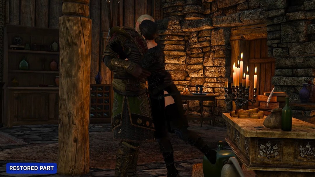 此外,模组还还原了任务结尾杰洛特与叶奈法牵手的温馨画面,并为该任务新增额外对话。还原内容远不止于此,还包括:希里与狂猎战士的附加对话场景、杰洛特返回凯尔莫罕后与艾斯凯尔的新增对话,以及在“血腥男爵”任务中曾被删除的、允许玩家明确表达是要杀死还是解除尸婴诅咒的选项。据推测,最后一项改动因不影响任务最终走向而在原版中被删除。