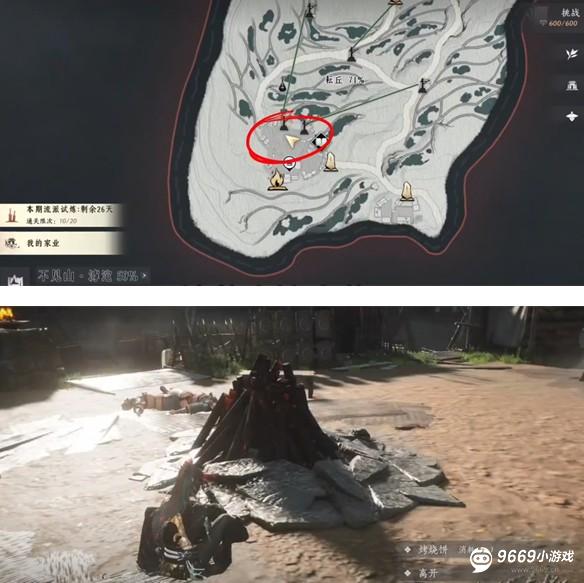 获取到足够的烧饼以后,来到下图的位置,来到篝火边选择取暖就可以烤烧饼了。