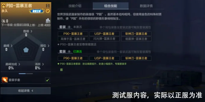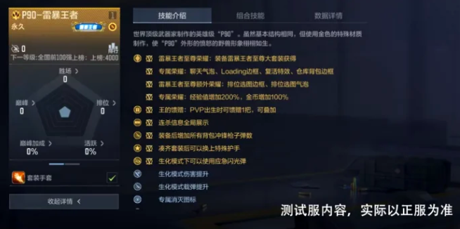 同时,集齐套装还有专属的“射击精度提升、射速小幅提升、专属套装手套”属性,集齐套装后的P90-雷暴王者不单能在生化模式中展露锋芒,更能在竞技模式里大放异彩。