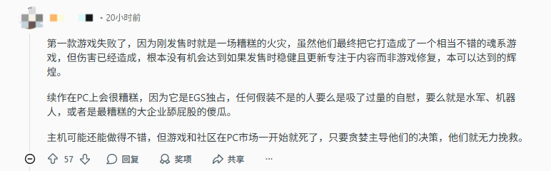 此举引发了部分玩家不满。有玩家表示:第一作发售时因质量糟糕而彻底扑街,虽然后来经过改进变成了相当不错的类魂系列作品,但损失已无法挽回,如果首发顺利、更新重心放在内容而非修复漏洞,本作本可能获得更高声望。续作在PC平台上注定要扑街,因为它是Epic独占,任何假装不会扑街的人,要么是在自我安慰过度,要么是水军、机器人,或者是最糟糕的大公司拍马屁人士。