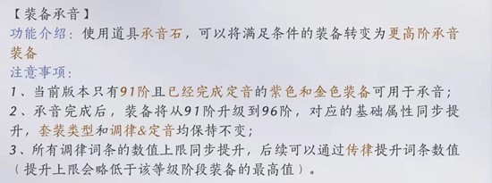 承音:提升原等级的武器至目前等级,现阶段可以把96阶的武器转变为100阶,同时保留原武器的词条类型和数值、定音不变,因此升级后会变为紫色词条