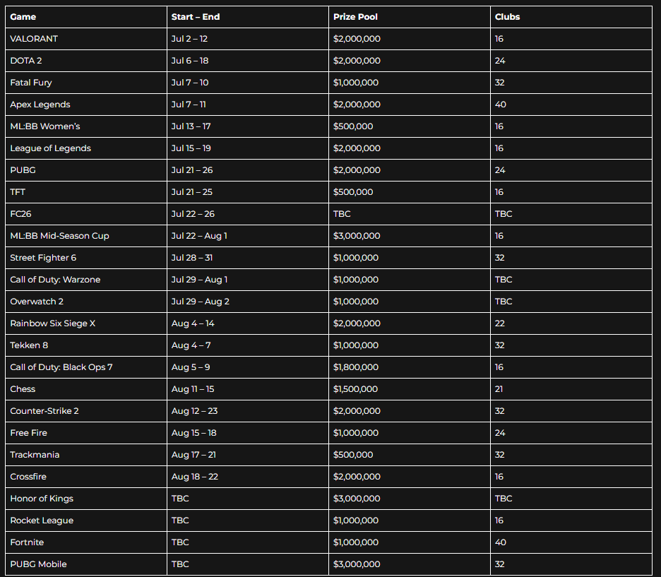 本届赛事总奖金较去年的7000万美元进一步提升。在7500万美元的总奖金中,有3000万美元将专门用于“EWC俱乐部冠军赛”,奖励在整个赛事周期中综合表现最佳的顶级电竞俱乐部,其中冠军俱乐部将独揽700万美元。剩余超过3900万美元的奖金将分配至各单项赛事,每项赛事均设有丰厚的MVP个人奖励。
