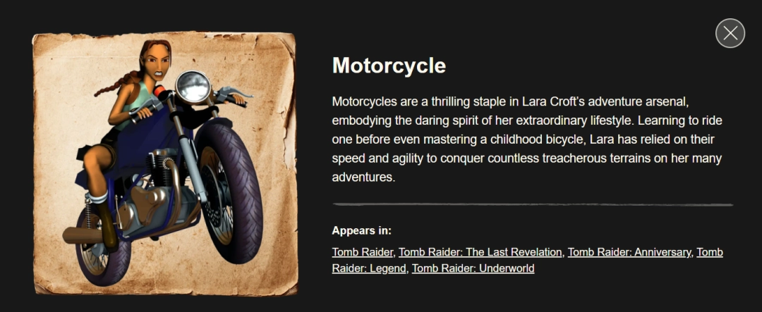 《古墓丽影》官方在更新劳拉·克劳馥的角色简介时,将摩托车列入了她形象的核心要素之一——这是近二十年来系列游戏中未出现的交通工具。粉丝普遍认为,这一更新间接暗示了摩托车将在预计于2027年发售的《古墓丽影:催化剂》中回归。