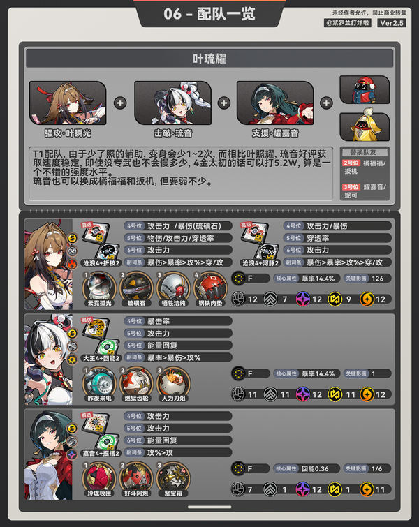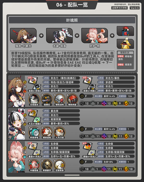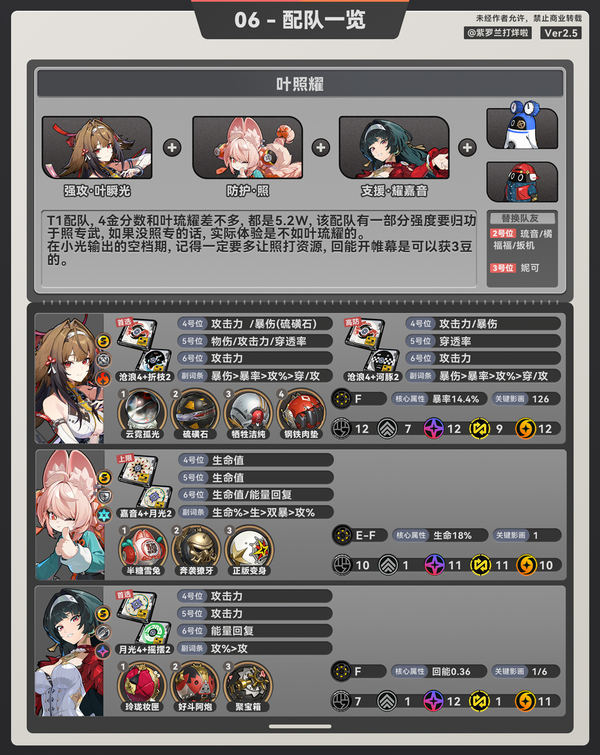 照:同理照也是工具人,她也需要堆回能,但考虑到6号位堆回能,生命词条压力太大,绳匠们可以考虑将云岿2改成月光2。