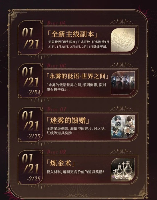 世界之外二周年庆典活动全新副本,海量福利,丰富活动,现已全面开启!永雾的低语世界之间「永雾的低语」系列侧影限时感召概率提升!更多福利:首充双倍再重置;全新等级上限,成长基金3.0同步开启!更多春节、情人节活动,即将陆续更新,敬请期待!