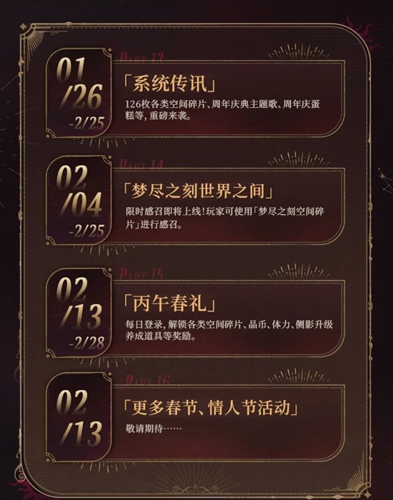 ✦系统传讯✦1月26日,总计126枚各类空间碎片、周年庆典主题歌、周年庆蛋糕等福利,重磅来袭。