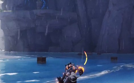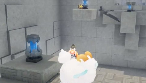 第三处宝箱所在区域需配合金色球体与水域木箱协同操作。先将区域内悬浮的金色球体移出原位,随后潜入右侧水域,拖动漂浮木箱至指定位置作为临时踏板,由此进入上方隐蔽夹层。进入后,将木箱重新推回水中,使其浮起高度恰好填补下方电路缺口,形成阶梯状结构,沿此结构攀上高台即可获得宝箱。