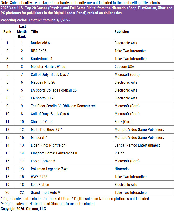 此外,统计机构还发布了2025年全年美国最畅销的数字和实体版游戏,《战地6》首次超越《使命召唤》登顶销量榜。这是否意味着COD在游戏界的统治力就此终结?