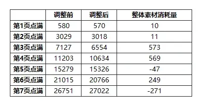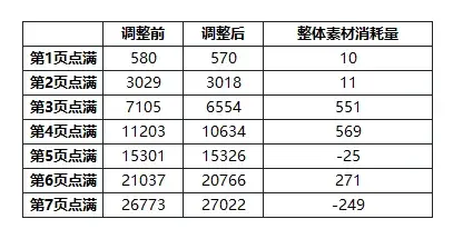 在此我们将调整后的详细整体素材消耗量增减向大家一一告知,以减少大家的困惑与误解: