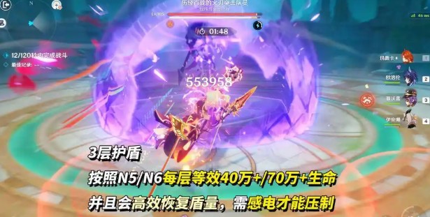 1、开局展开3层护盾,推开接近角色,伴随落雷攻击;每层护盾等效N5难度40万+生命、N6难度70万+生命,且护盾会高速修复。
