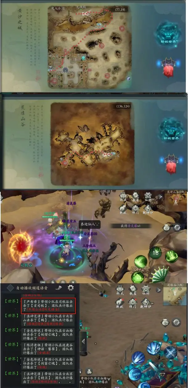 黄沙之城——荒凉山谷——打完BOSS,出现传送门——司秋谷首杀,不周山石。