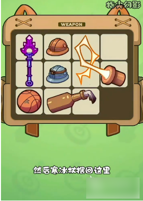 再摆上一个一级头盔,将闪电边摆放在最右边的三个格子中,之后将3级寒冰杖放置在最左侧的两个格子中,将燃烧瓶合成2级,将最后出现的1级头盔与格子中的1级头盔和2级头盔合成3级,就可以开始战斗了。