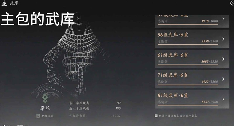 装备:如果你装备差不多都毕业了,我说的是面板毕业,而不是指机甲号,那就不用追求极致继续毕业装备了,那是竞速玩家才需要考虑的事,或许你应该考虑刷51、56和61等级副本打造全金词条装备和定音石提升武库造诣,大家可以根据自己武库装备的情况查漏补缺。