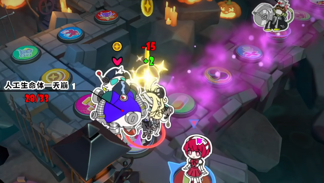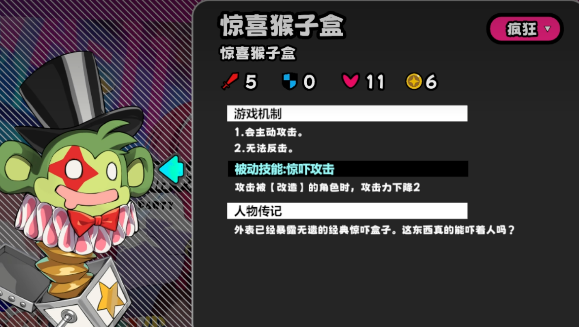 盒子作为低威胁单位,无反击能力,且路过即可攻击。当对其造成伤害时,若攻击方携带改造buff,则自身攻击力永久降低2点。所有怪物掉落星币数量已在图鉴中明确标注,便于玩家预判战斗性价比。精英单位“圆锯猴”具备反击特性,并在每三回合对六格范围内未携带改造buff的目标施加三层改造buff;击杀后必定掉落一张糖果卡,是关键资源的重要来源之一。