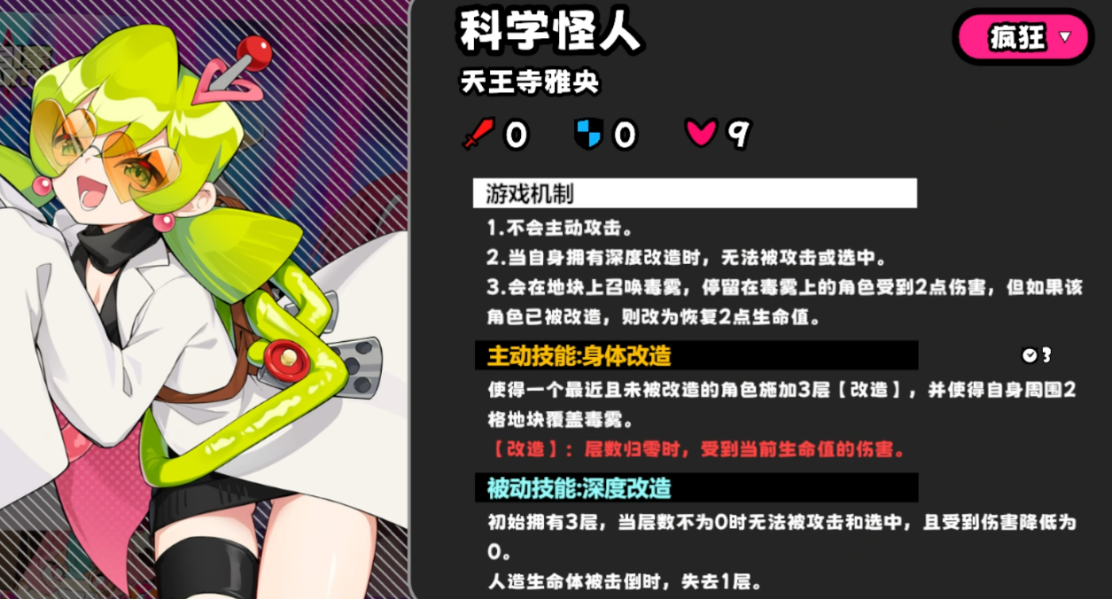 开局即直面最终Boss“科学怪人雅央”,其初始具备三层无敌状态,无法被常规手段破防。破盾唯一路径为击杀场景中的三种人工生命体:天崩、噩兆与混乱。每成功击败一名人工生命体,可消除一层无敌效果。地图中央存在固定毒雾区域,未携带改造buff的角色驻留将每回合损失2点生命值;而拥有该状态者则可反向回血,形成机制上的双重判定。