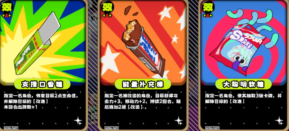 改造buff具有倒计时属性:角色每次行动结束后自动减少一层持续时间,归零时触发自爆,伤害数值等同于当前生命值。该机制虽具威胁性,但存在明确应对手段——地图中央新增特殊地块支持消耗五星币进行随机抽卡,三类糖果卡牌功能各异:软糖、口香糖可立即清除改造buff;士力架则延长其剩余持续时间。因此,高效积攒星币成为本图资源管理的首要目标,建议优先清理基础怪物“盒子”以稳定获取收益。