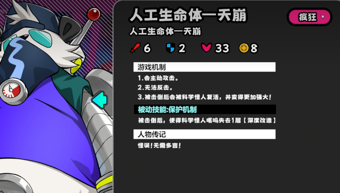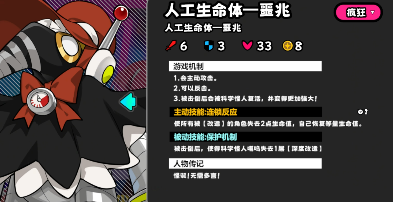 人工生命体“天崩”不具备反击能力,但被击杀后将在下一回合于Boss位置复活为“噩兆”。当进度条达到第4阶段时,系统将强制刷新三只盒子与一只圆锯巨;噩兆登场同步触发事件,在指定坐标生成一只圆锯猴与一只科学怪猿。后者具备反击能力,且对携带改造buff的目标发动攻击时,自身攻击力提升3点。相较天崩,噩兆新增反击机制,并每两回合对全体带改造buff角色造成2点伤害,同时恢复等量生命值。
