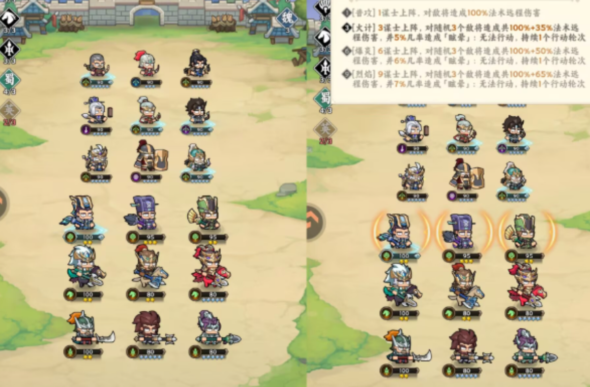 实战部署需注重环境适配性:若遭遇存在障碍物或命中率衰减的地图机制,建议将1至2名射手临时替换为谋士角色,以保障关键技能的释放稳定性。同时,资源分配策略尤为关键——优先集中投入于核心射手角色的等级提升、技能解锁与羁绊激活,避免资源分散导致战力断层。