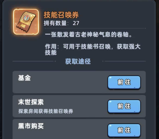 技能书获取主要依赖两条稳定渠道:其一是通过技能召唤券进行概率抽取;其二是激活技能书基金——该功能在角色每次进阶时自动发放固定数量技能书,属于零成本累积途径。此外,末日世界探索地图中,所有标有“开启门”图标的房间均藏有召唤券奖励;黑市商店虽支持直接购买,但单张售价达150钻石,建议保留至中后期资源宽裕阶段再酌情使用。另一补充方式为场景探索,在高难度关卡节点中,存在直接掉落完整技能书的概率,尤其包含限定款技能书,欧气充足者可大幅缩短养成周期。