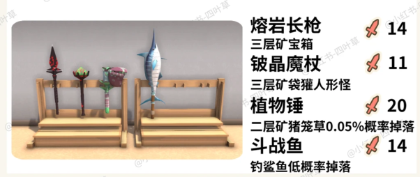 金垦小镇Dinkum中的武器有木质球棒、鳄鱼尖牙棒、火焰棒、基础长矛、铜矛、铁矛、基础锤子、铜锤、铁锤、平底锅、战斗铲子、糖果手杖、气球剑、战斗扫帚、狂热粉丝手指、弹弓、高级弹弓、骨弓等等,下面为大家列举具体的各个武器以及攻击数值。
