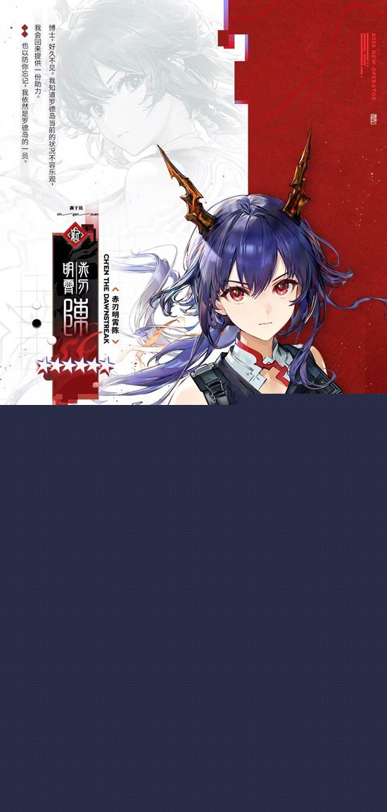赤刃明霄陈作为陪跑六星,将在2月12日04:00后加入并常驻标准寻访卡池,博士无需急于在当前池投入全部资源。