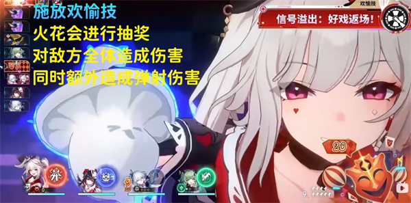 火花作为首个欢愉命途输出角色,其输出方式主要靠战技进入“直播间pk刷礼物”和进入“阿哈时刻”抽奖输出