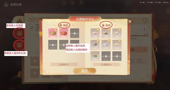 ⑧客人有不同的喜好(锅底和菜),除了客人要求的菜,还可以加赠一盘他喜欢的菜。具体参考,来源@玩战术的 非常感谢老师的攻略让我少走了很多弯路。在管理店铺界面可以查看客人好感度,爱心全红就是满了,好感度满了会留言送礼物。