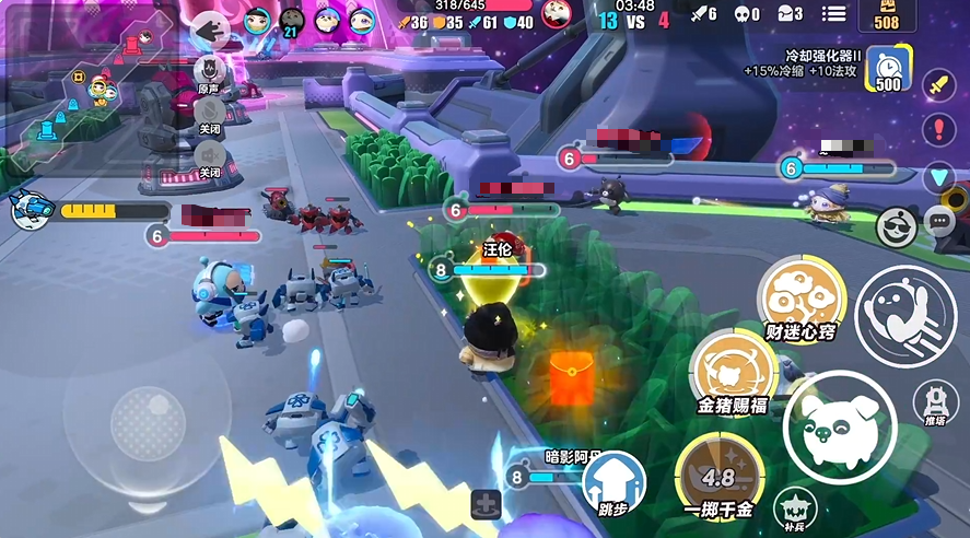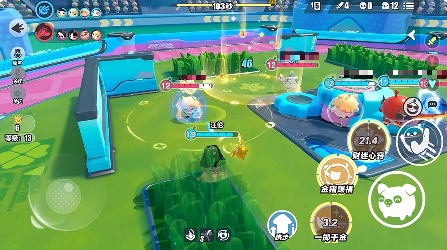 二技能“金猪赐福”可为目标友方施加护盾与移速增益,并在短暂延迟后于其周围触发范围爆炸,造成伤害与减速,适用于关键队友保命、突进或撤退场景。