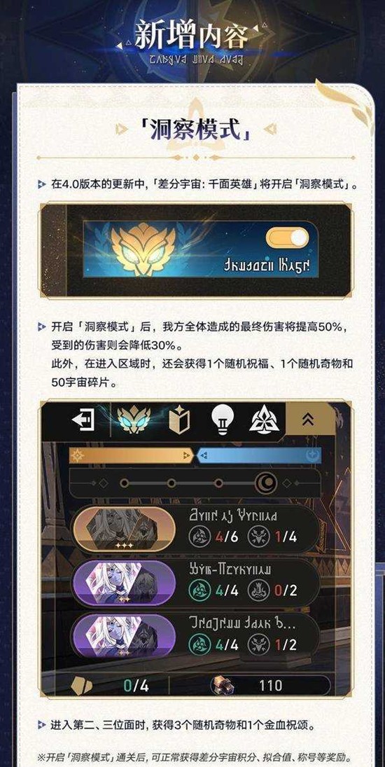 崩坏星穹铁道4.0版本为差分宇宙新增了「洞察模式」。开启该模式后,我方全体造成的最终伤害将提高,受到的伤害则会降低。在进入区域时,还会获得随机祝福和宇宙碎片。此外,在进入第二、三位面时,可获得随机奇物和金血祝颂。开启「洞察模式」通关后,可正常获得差分宇宙积分、拟合值、称号等奖励。这一模式大幅降低了挑战难度,适合想要快速获取奖励或体验流派搭配的开拓者。