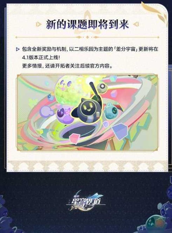 崩坏星穹铁道4.0差分宇宙有哪些重要改动很多开拓者不清楚4.0版本差分宇宙更新了哪些内容,其实本次更新涉及洞察模式开启、双倍拟合值获取以及赛季奖励重置等多个方面,下面我们一起来看看崩坏星穹铁道4.0差分宇宙更新说明。