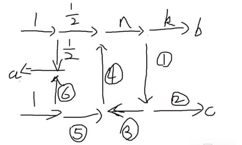 情况一:a口加压比较小,n没有爆掉,于是⑤=⑥恒为1/2,则此时a=1,b=k,c=1-k。