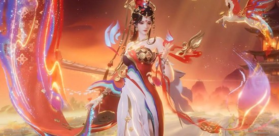 这款皮肤以丝绸之路起点长安为核心灵感,联动西安博物院打造。貂蝉化身「万邦使者」,服饰采用朱红裙摆搭配玄黑广袖,金色非遗盘金绣纹样点缀其间,肩生双翼的翼马图腾与石榴花元素贯穿全身。黑发蒙面造型搭配红绸面纱,被众多玩家誉为「美神降临」。整体配色雍容华贵,既保留了貂蝉的柔美气质,又增添了盛唐气象的庄重感。